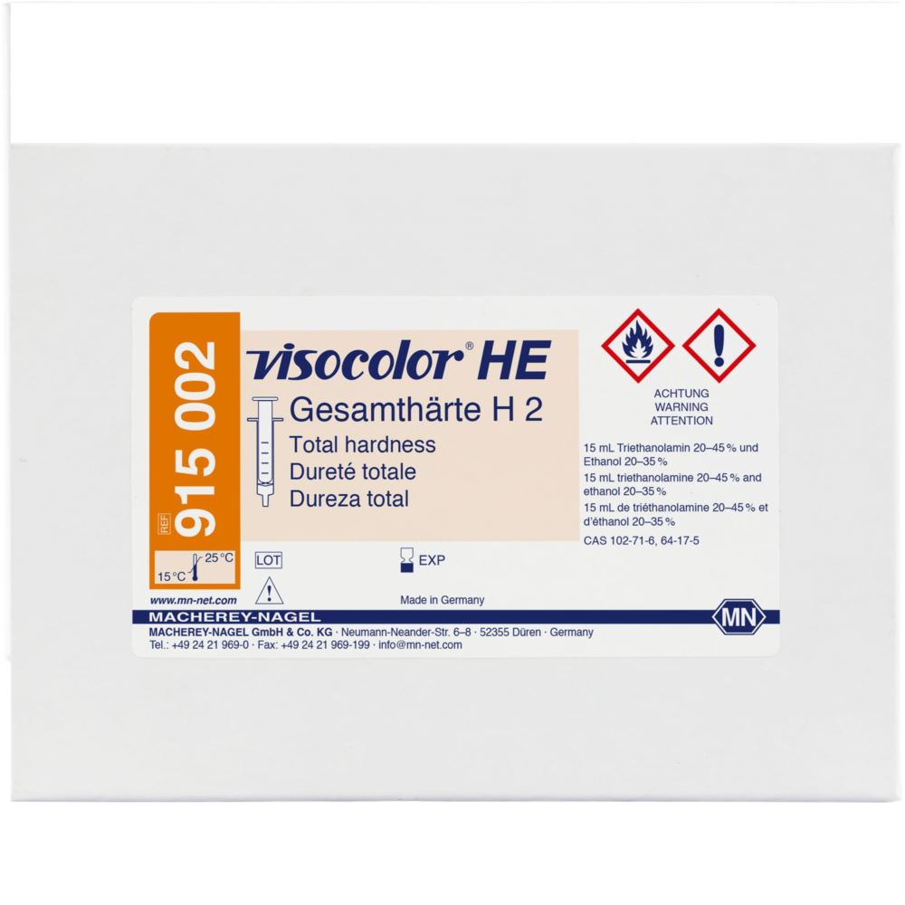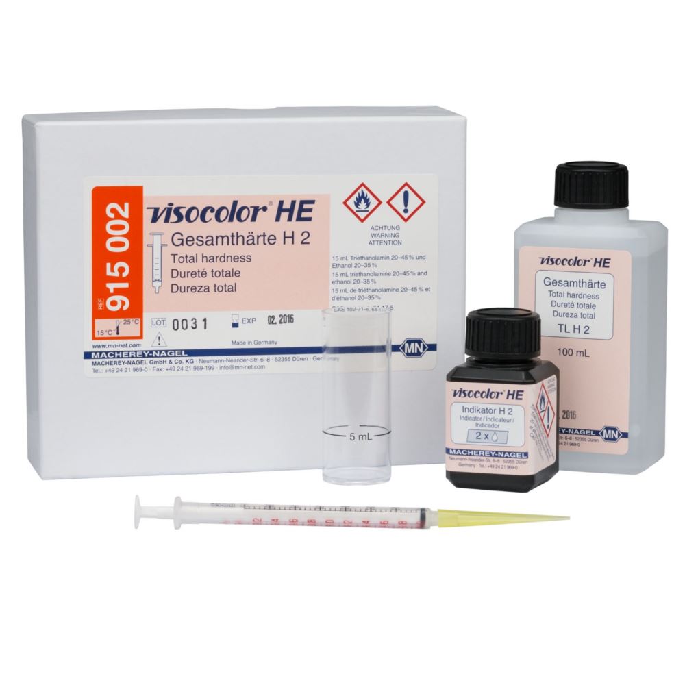 Test VISOCOLOR Twardość ogólna H 2 jest zestawem dzięki, któremu możemy oznaczyć twardość resztkową wody miękkiej metodą miareczkowania kompleksometrycznego. Metoda jest analogiczna do APHA 2340 C; DIN 38406-E3-3.