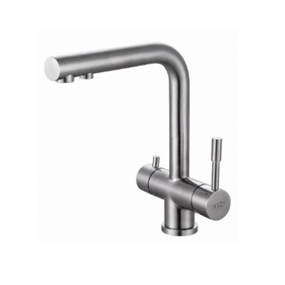 Bateria firmy Blue Water do wody sieciowej (zimnej i ciepłej) oraz wody filtrowanej. W komplecie dostępna z akcesoriami niezbędnymi do prawidłowej instalacji. Nowoczesna i stylowa bateria, wykonana z materiałów najwyższej jakości. Bateria wyposażona jest w dwa perlatory, osobno do ujścia wody sieciowej (zimnej i ciepłej) oraz osobno do wody filtrowanej.