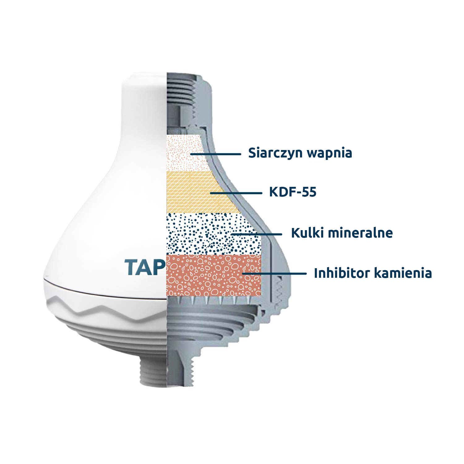 Wkład wykorzystuje działanie złoża filtrującego KDF 55 ( zawierającego granulat miedzi - cynk posiadają skuteczność potwierdzoną laboratoryjnie).