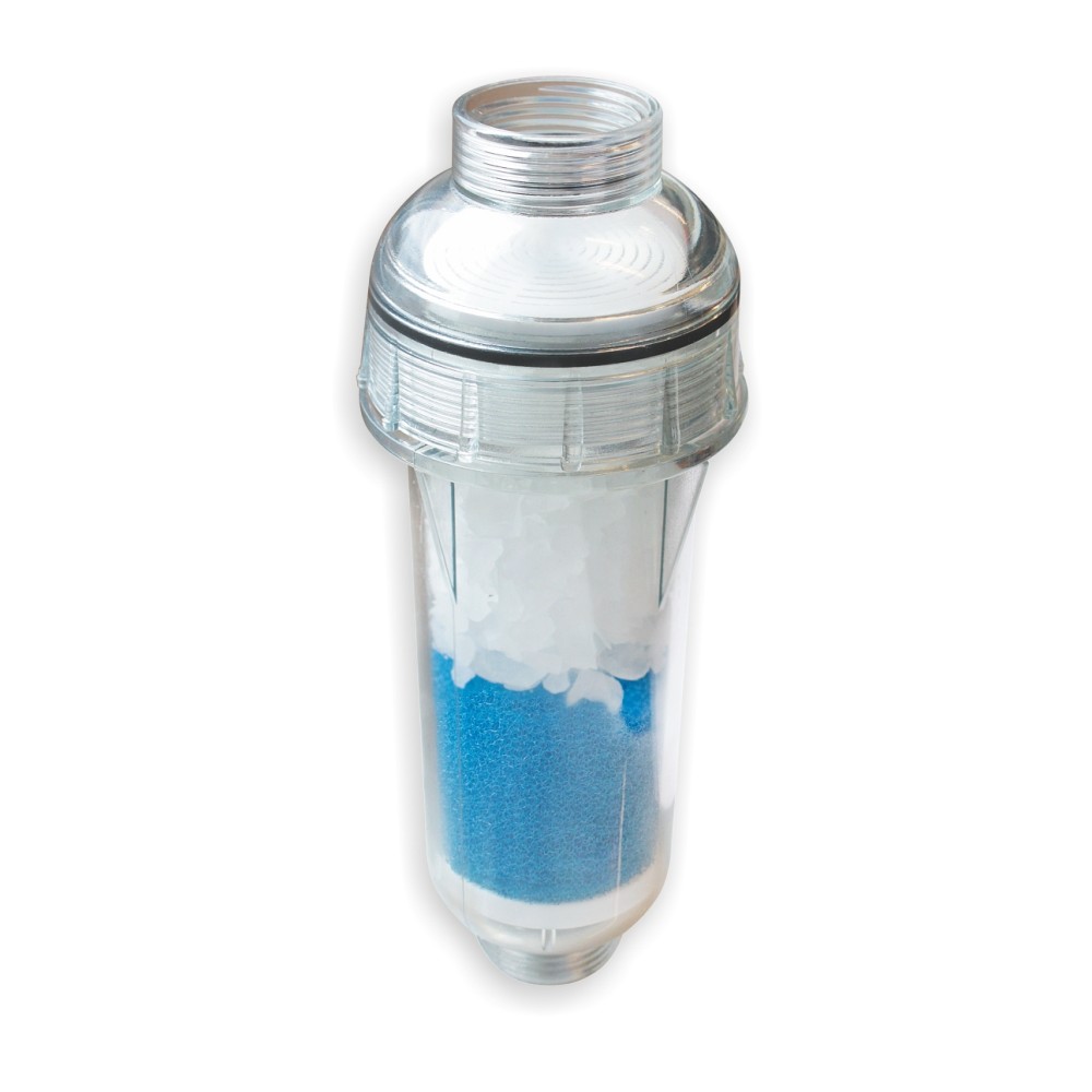 Filtr zakończony przyłączami gwintowanymi 3/4 cala (standard dla pralek i zmywarek). Z jednej strony jest to gwint wewnętrzny, a z drugiej zewnętrzny. Pozwala to w prosty sposób wkręcić go między wąż zasilający a zawór lub między wąż a pralkę/zmywarkę. Całość wypełniona rozpuszczalnym złożem- polifosfatem i gąbką w proporcji 50/50. Stabilizuje on związki żelaza zapobiegając powstawaniu rdzawych plam na armaturze. Polifosfat powoduje również stopniowe rozpuszczenie istniejącego kamienia. Polifosforan działa na dwa sposoby. Reaguje ze związkami wapnia, magnezu i żelaza znajdującymi się w wodzie stabilizując je i uniemożliwiając ich agregację w większe kryształy. Dodatkowo tworzy cienką warstwę wewnątrz rur uniemożliwiając odkładanie i tworzenie złogów kamienia. Należy pamiętać, że polifosfat nie zmiękcza wody. Po zużyciu się wkładu filtr można wymienić na nowy bądź uzupełnić w nim zużyte złoże.