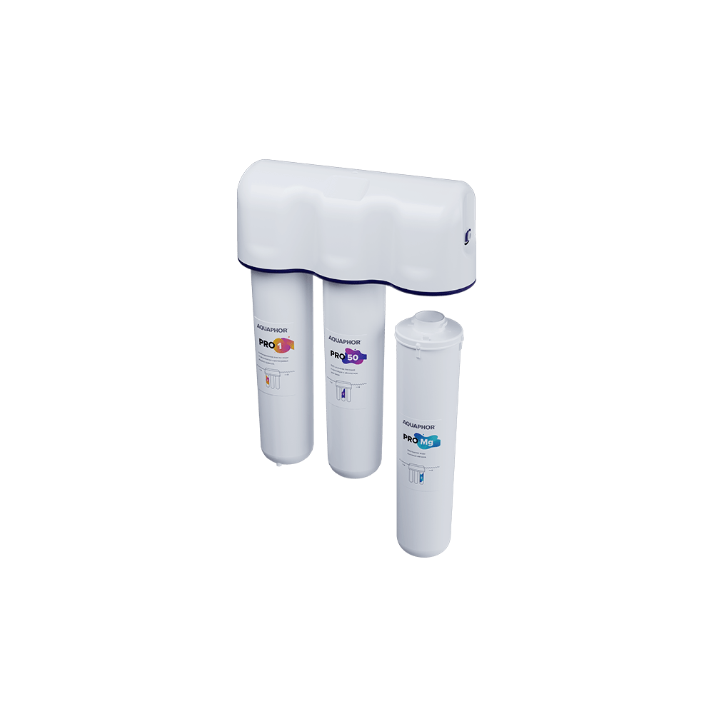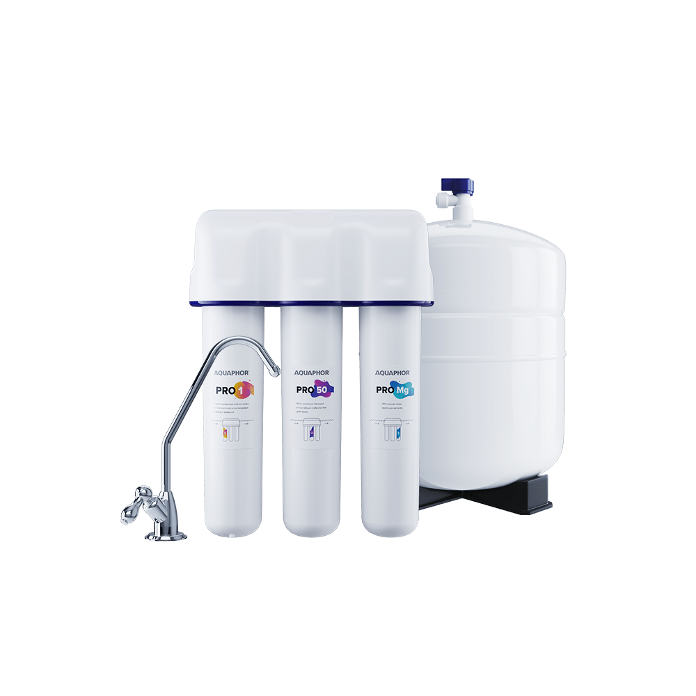 System odwróconej osmozy z kompaktowym zbiornikiem i innowacyjnymi wkładami serii Pro. Wkład wstępny Pro 1 2w1 do usuwania zanieczyszczeń mechanicznych o zwiększonej skuteczności filtracji zastępuje dwa wkłady wstępne stosowane w poprzedniej generacji serii filtrów AQUAPHOR Osmo Pro 50 zawiera membranę RO, która bardzo dokładnie usuwa z wody nawet najbardziej niebezpieczne zanieczyszczenia, w tym wszelkie substancje toksyczne, bakterie i wirusy. PRO M odpowiada za końcowe uzdatnianie i remineralizację wody.