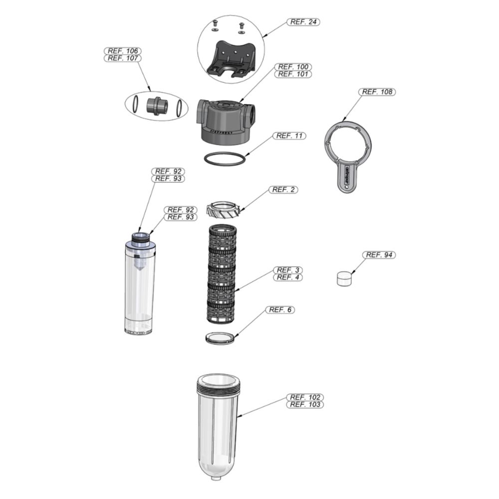 Zastosowana wewnętrzna łopatka wprawia ciecz w ruch wirowy, co – dzięki efektowi cyklonowemu – pozwala oddzielić większe cząstki stałe, takie jak piasek, ziemia czy rdza, kierując je do dolnej części obudowy. Skuteczność filtracji uzależniona jest od rodzaju i dokładności zastosowanego rękawa filtrującego (mikronażu).