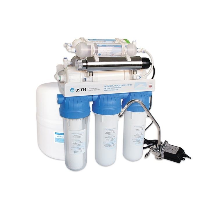 Kompletny system uzdatniający wodę metodą odwróconej osmozy RO8. Filtr zapewniający czystą wodę, bez osadzania się zawiesin i kamienia, bez brunatnych i białych zacieków - wodę idealną do przygotowywania kawy, herbaty itd. Filtr z końcową mineralizacją wody i biorezonatorem. Filtr wyposażony w sterylizator wody (lampa bakteriobójcza UV-C), zapewniającą czystość biologiczną wody na poziomie 99,99%. RO8 to nowoczesny ośmiostopniowy system odwróconej osmozy. Wyposażony został w trzy filtry wstępne, membranę osmotyczną oraz liniowy filtr końcowy. Wkład sedymentacyjny wykonany z włókniny polipropylenowej o zdolności filtracji 20 mikronów. Jego głównym zadaniem jest zatrzymanie nierozpuszczonych w wodzie zanieczyszczeń, mogących zanieczyścić wkład węglowy. Wkład z węglem aktywowanym- jego głównym zadaniem jest usunięcie z wody chloru, który jest szkodliwy dla membrany osmotycznej. Dodatkowo wkład ten, usuwa z wody rozpuszczone w niej zanieczyszczenia organiczne oraz niektóre metale ciężkie. Wkład mechaniczny polipropylenowy o filtracji do 5 mikronów, chroni membranę osmotyczną przed drobinami węgla aktywowanego, mogącymi doprowadzić do mechanicznego uszkodzenia powłoki filtracyjnej. Membrana osmotyczna usuwająca z wody 96-99% wszelkich rozpuszczonych w niej związków. Z uwagi na wielką dokładność filtracji, membrana eliminuje również część wirusów i bakterii. Membrana jest sercem systemu odwróconej osmozy. Wszystkie inne wkłady znajdujące się przed membraną (stopnie 1-2), pracują na rzecz jej ochrony. Lampa UV - liniowa- sterylizuje wodę z mikroorganizmów (m.in. bakterii i wirusów). Przedłuża czystość biologiczną zbiornika i zapewnia czystość biologiczną wody na poziomie do 99,99%. Filtr liniowy węglowy- główne zadanie tego stopnia filtracji, to zatrzymanie substancji lotnych, mogących pojawić się w wodzie uzdatnionej przez membranę i zgromadzonej w zbiorniku. Mineralizator dolomitowy - liniowy. Wzbogaca wodę w szereg naturalnych związków mineralnych (m.in. wapń, sód, potas i magnez). Bioceramiczny filtr FIR - liniowy. Wpływa korzystnie na przyswajanie tlenu z wody przez organizm człowieka. Naturalne złoże turmalinu znajdujące się w filtrze, znajduje szerokie zastosowanie w medycynie niekonwencjonalnej.