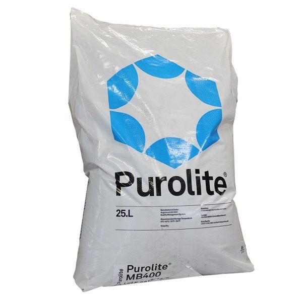 Żywica MB400 jest gotową do użytku, jednorodną mieszanka anionitu i kationitu otrzymaną przez dokładne zmieszanie tych dwóch żywic jonowymiennych. Jest przeznaczona do demineralizacji wody, usuwania zanieczyszczeń szczątkowych lub jako ostatni stopień filtracyjny (np. w systemach odwróconej osmozy, elektrodializy i dystylacji). MB 400 ma zastosowanie w domowych i przemysłowych urządzeniach do doczyszczania wody osmotycznej. PUROLITE MB400 pozwala na uzyskanie wody głęboko zdemineralizowanej. Najlepsze wyniki uzyskujemy, jeśli złoże jest stosowane jako ostatni stopień doczyszczający - np. po procesie odwróconej osmozy. Do regeneracji złoża Purolite MB400 wymagana jest specjalna kolumna, w której przeprowadza się hydrauliczną separację kationitów i anionitów, a następnie niezależną regenerację roztworami HCl i NaOH. Żywotność złoża Purolite MB400 zależy od zawartości chemicznej wody. Zalecane jest, aby woda do demineralizacji, poddana była wcześniej uzdatnianiu metodą odwróconej osmozy.
