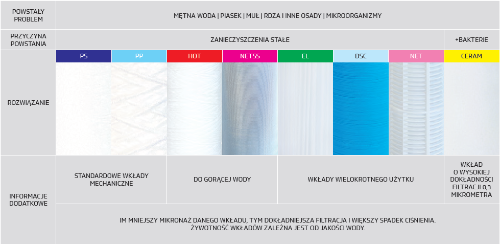 Wkłady 10" ze sznurka polipropylenowego PPHOT5, PPHOT10, PPHOT20, PPHOT50 nadają się do gorącej wody. Wkład zapewnia doskonałą filtrację mechaniczną na poziomie 5, 10, 20 lub 50 mikronów (w zależności od wybranego wkładu). Charakteryzuje się dużą żywotnością, odpornością na wysokie temperatury (do 80 °C) i substancje chemiczne, a filtrowanie wody powoduje tylko małe spadki ciśnienia. Specjalna metoda nawijania przędzy na rdzeń powoduje, że produkt ma budowę gradientową, gęstość włókien zwiększa się do wnętrza wkładu, malejący mikronaż zwiększa skuteczność filtracji.
