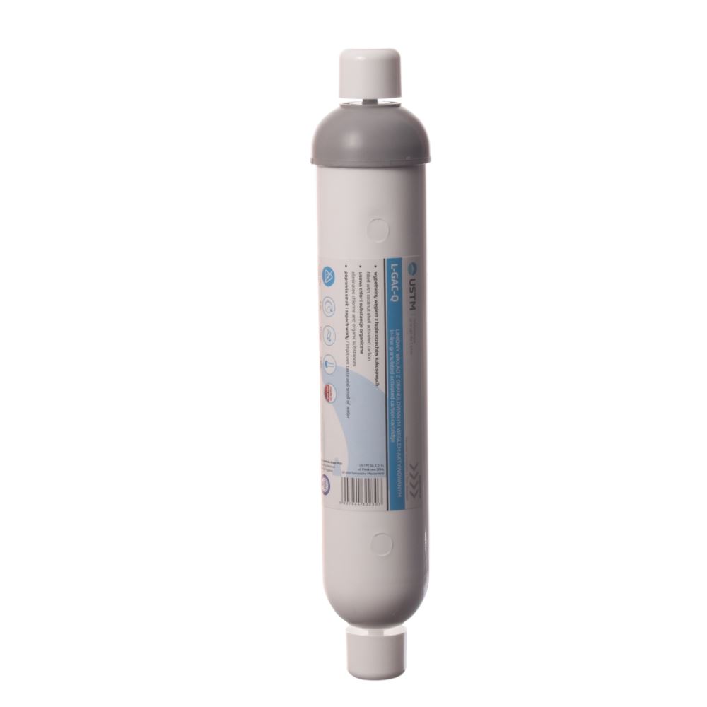 Liniowy filtr węglowy L-GAC-Q, wypełniony jest najwyższej jakości złożem z granulowanym węglem aktywowanym z łupin orzechów kokosowych. Niezwykle skuteczne w usuwaniu niechcianych zanieczyszczeń z wody i poprawie jej smaku i zapachu. Standardowo montowany w filtrach odwróconej osmozy, ale jest również stosowany do filtracji wody przed lodówkami z dystrybutorem wody i kostkarką. Filtr L-GAC-Q posiada zakończenie stosowane w nowoczesnych filtrach - mechanizm wtyku 1/4 cala (ok. 6-6,5 mm). Ten sposób montażu filtra wymiennego, zapewnia maksymalną pewność połączenia, jego szczelność oraz łatwość montażu. Konstrukcję wkładu zaprojektowano tak aby jego montaż i wymiana była prosta i nie wymagała stosowania specjalistycznych narzędzi. Wielkość ziaren węgla została dobrana tak, aby woda pozostała dłużej w kontakcie ze złożem zapewniając maksymalną skuteczność adsorpcji zanieczyszczeń. Liniowe filtry węglowe w zależności od miejsca zastosowania, mogą służyć jako filtry wstępne (np. w zabudowanych systemach nLine, Water Life i For Life) oraz jako filtry końcowe- szlifujące w większości typowych systemów odwróconej osmozy. W przypadku gdy filtr zamontowany jest przed membraną (systemy zabudowane), zalecana jest wymiana po 3 miesiącach, jednak nie rzadziej niż co pół roku. W przypadku gdy filtr zamontowany jest na końcowym etapie uzdatniania wody, wkład można wymieniać nie rzadziej niż co rok.