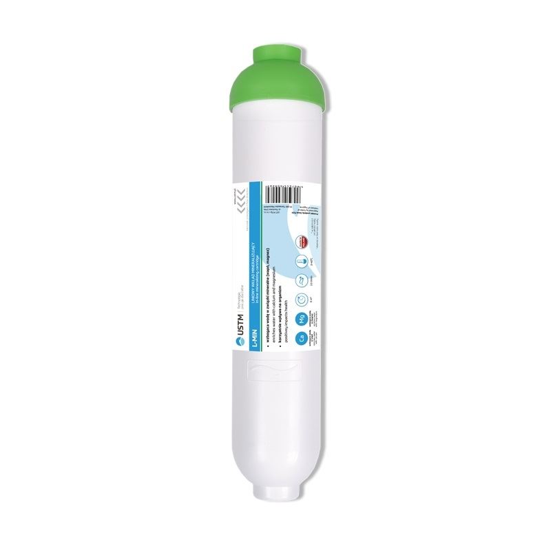 Mineralizator wodyL-MIN to liniowy wkład filtracyjny mineralizujący, który zapewnia odpowiednią kompozycję naturalnych związków (minerałów), które nasycając wodę sprawiają, że jej parametry odpowiadają dobrym wodom mineralnym. Woda pozbawiona minerałów w procesie odwróconej osmozy zostaje w nie znów wzbogacona przepływając przez filtr (m.in. w wapń, magnez, potas i sód). Wkłady zostały wypełnione wysokiej jakości złożem dolomitowym. Wapń m.in. stanowi składnik kości i zębów, bierze udział w procesie skurczy mięśni, pełni ważną funkcję w procesie wydzielania hormonów. Magnez bierze udział w ponad 300 procesach biochemicznych. Jest niezbędny do prawidłowego funkcjonowania układu nerwowego oraz immunologicznego. Mineralizator pasuje do większości filtrów RO, w których połączenia oparte są o standardowe otwory montażowe 1/4 cala, w które wkręca się złączki montażowe (np. kolanka, trójniki itp). Połączenie złączki z wkładem należy uszczelnić taśmą teflonową. Konstrukcję wkładu zaprojektowano tak, aby jego montaż i wymiana była prosta i nie wymagała stosowania specjalistycznych narzędzi. Wielkość ziaren węgla została dobrana tak, aby woda pozostała dłużej w kontakcie ze złożem, zapewniając lepszą mineralizację. Wkład zainstalowany w odwróconej osmozie, powinien być wymieniany na nowy nie rzadziej, niż co 12 miesięcy.