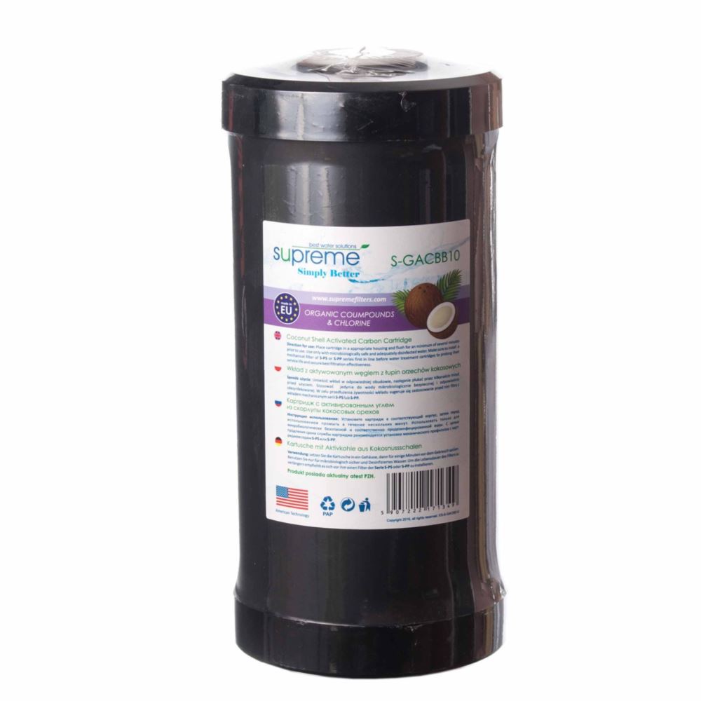 Wkład węglowy S-GACBB10 z wysokiej jakości aktywowanym węglem z łupin orzechów kokosowych, który posiada dużą zdolność adsorpcji chloru oraz innych zanieczyszczeń organicznych zawartych w wodzie. Wkład filtracyjny nadaje wodzie doskonały smak oraz zapach, uwydatniając tym samym smak oraz aromat potraw i napojów.